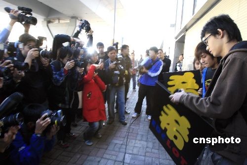 連日來轟動香港的網(wǎng)上裸照事件的主角陳冠希二月二十一日終于出現(xiàn)在香港的媒體面前,他在記者會中宣讀聲明,承認(rèn)網(wǎng)上流傳的藝人裸照,是他拍攝,但是別人非法取得。陳冠希用英文發(fā)言,多次向事件中的受害女性、自己的父母及香港的青少年道歉,希望大家原諒他。他在會上宣布,待完成手上的工作后,將永久退出香港的娛樂圈,未來數(shù)月,他將從事慈善工作。會場外,三位陳冠希的“粉絲”舉著“希”字牌,引來大批記者拍照。中新社發(fā) 王麗南 攝