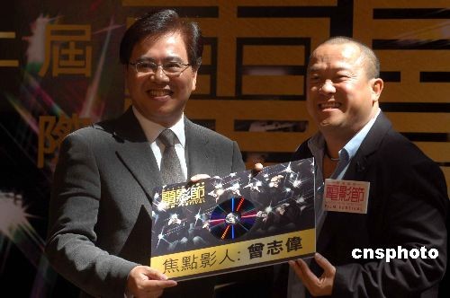 二月二十一日,香港國際電影節協會主席王英偉(左)在記者會上向曾志偉頒獎。由香港國際電影節協會主辦的第三十二屆香港國際電影節,將于三月十七日至四月六日舉行。中新社發 譚達明 攝