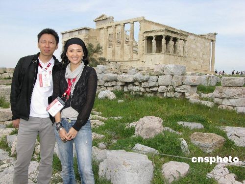 當地時間3月22日下午,搜狐公司董事局主席兼首席執行官張朝陽、搜狐奧運官網特約記者章子怡與奧運官方網站圣火報道團一行前往帕納辛納克斯泛雅典體育場、衛城等雅典遺址,沿著奧運圣火傳遞的足跡,率先為中國億萬網民傳遞當地備戰奧運圣火傳遞的盛況。圖為張朝陽(左)與章子怡在雅典衛城采風。中新社發 沈晨 攝