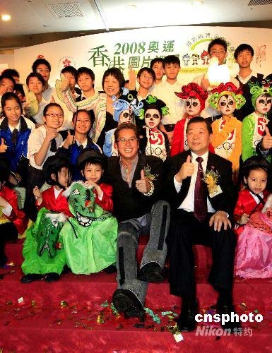 “精彩瞬間,永恒奧運-香港·2008奧運圖片巡展”四月二十五日在香港中央圖書館開幕,香港著名歌星譚詠麟被邀擔任主禮嘉賓,并接受多家媒體采訪談對北京奧運會的期待。譚詠麟(左)、文匯報社長張國良與學生們合影留念。中新社發(fā) 王麗南 攝