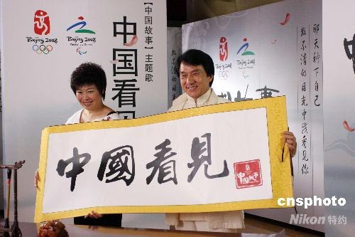 2008年7月8日,北京,2008奧林匹克公園中心區(qū)文化展示活動(dòng)“中國(guó)故事”的主題歌《中國(guó)看見》正式發(fā)布。此歌由國(guó)際巨星成龍與著名歌唱家譚晶攜手演唱。成龍和于丹共同書寫了“中國(guó)故事”主題歌《中國(guó)看見》的卷軸。中新社發(fā) 博芽影像 攝