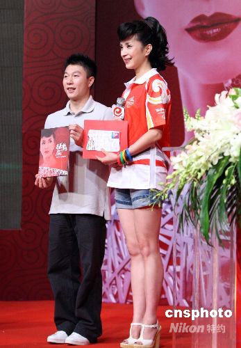 9月21日,素有“時尚民歌天后”之稱的青年歌手湯燦在北京推出為北京奧運健兒量身定制的單曲《光榮與夢想》。奧運體操冠軍李小鵬到場祝賀,并向湯燦贈送中國全體奧運冠軍親筆簽名的奧運首日封。中新社發 廖文靜 攝