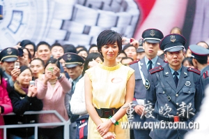 和郭富城上次來渝參加活動一樣,昨天下午,解放碑中心到郵局一段,被主辦方用鐵柵欄圍了起來,柵欄外的粉絲擠得水泄不通。不過老徐并沒有像某些明星一樣耍大牌,而是穿著一身無袖金色小禮服準(zhǔn)時出現(xiàn)在現(xiàn)場,在10℃的低溫下赤膊上陣。粉絲們沒有上次郭天王來時聲嘶力竭的吶喊,倒是響起了各種評頭論足的聲音,大家最關(guān)注的是“徐靜蕾冷不冷”,當(dāng)然也有一些大媽級的業(yè)余“粉絲”頗有些失望地表示,“完全是個小女孩兒嘛!”