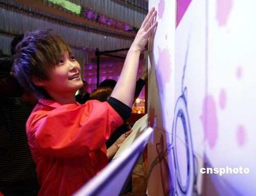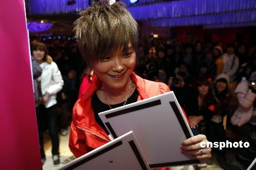 12月下旬,人氣藝人李宇春在北京出席新銳配飾品牌ctf2舉辦的“2008我的彩色夢(mèng)想”頒獎(jiǎng)儀式,并與眾多時(shí)尚彩繪愛好者進(jìn)行互動(dòng)游戲。該活動(dòng)上展示了ctf2在2008年從全國(guó)10所高校與社會(huì)征集來的近千幅CoCo Cat新形象作品,揭曉2009年ctf2 CoCo女郎最新形象。李宇春現(xiàn)場(chǎng)為獲獎(jiǎng)?wù)哳C獎(jiǎng)。中新社發(fā) 楊可佳 攝