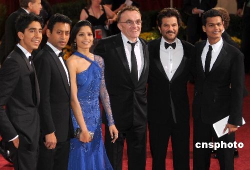 第八十一屆奧斯卡電影金像獎頒獎典禮二月二十二日晚在好萊塢柯達劇場舉行。印度“平民”演員出演的《貧民富翁》如愿以償地榮獲年度最佳影片大獎,成為當晚最大贏家。圖為該片主要演員走過紅地毯。中新社發 張煒 攝