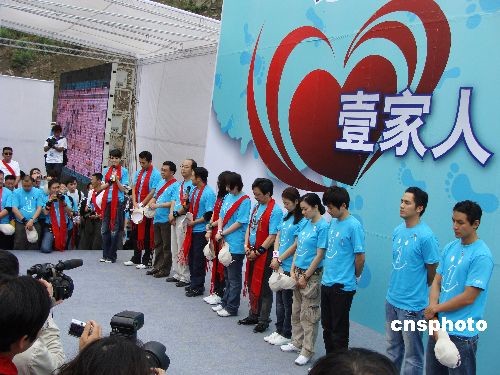 2009年5月10日,在“5·12”汶川大地震震中映秀鎮,李連杰攜吳彥祖、林心如、鐘麗緹、柯以敏、鐘漢良、沈星、張杰等眾多明星義工,開展中國紅十字會壹基金主辦的“壹家人,壹起走”大型戶外援建災區公益活動。來自各地的300多名媒體記者、志愿者和明星們一同走完了2公里的災區路。在半小時的路程中,完成了李連杰成立緊急救援聯盟等許多心愿,眾明星們的表現令人感動。 壹基金是由國際巨星李連杰發起的立足于中國的國際性公益組織,分別在中國大陸及香港地區、美國和新加坡設立了辦事機構。在中國大陸地區,壹基金與中國紅十字總會合作,成立了“計劃”,致力于傳播公益文化,搭建公益平臺,以推動全國公益事業的發展。中新社發 善平 攝