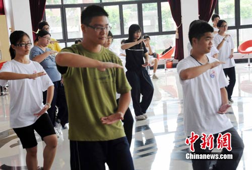 中新網7月5日電 7月5日,32名參加“2010年海峽兩岸青年聯歡節(jié)•中醫(yī)藥傳統(tǒng)文化研習營”的臺灣高校學子在福建中醫(yī)藥大學福州旗山校區(qū)學練24式太極拳。