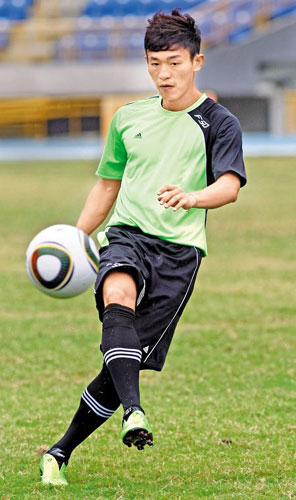 臺灣頂尖足球選手、中華臺北隊隊長陳柏良于臺北測試全新的世界杯比賽用球“普天同慶”。 圖片來源:臺灣《中國時報》