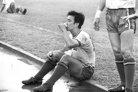 1967年第四屆亞洲杯東區足球預賽,林尚義趁中場休息時間,坐在濕濘的場地上喝水。 圖片來源:臺灣《中國時報》