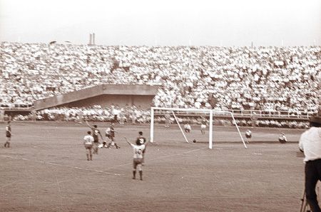 1967年第四屆亞洲杯東區足球預賽,中華臺北隊首度擊敗韓國。圖中可見臺北市立體育場擠滿人山人海。 圖片來源:臺灣《中國時報》