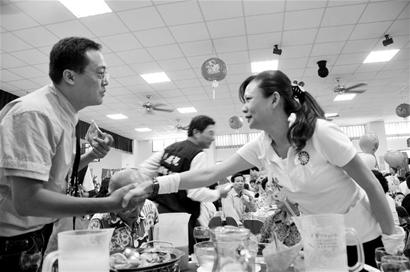 給記者記憶深刻的是,一直在我們身邊默默坐著的一對(duì)盛裝夫婦,他們?nèi)胱缶湍,吃了兩三樣菜后,突然?tīng)到司儀說(shuō):“請(qǐng)郭添財(cái)?shù)娜!蔽疑磉叺钠炫叟繋е⑿,款款走上舞臺(tái),拿起話(huà)筒開(kāi)始說(shuō)著洋洋灑灑的祝福語(yǔ),然后話(huà)鋒一轉(zhuǎn):請(qǐng)給專(zhuān)業(yè)、認(rèn)真、負(fù)責(zé)的郭添財(cái)博士一個(gè)機(jī)會(huì),給我們支持,好不好!我這才反應(yīng)過(guò)來(lái),身邊這對(duì)夫婦竟然是大臺(tái)南市長(zhǎng)候選人郭添財(cái)?shù)娜缛。郭家三嫂講完后,回到我們這一圓桌,舉杯和我們喝了口酒,然后從包里拿出郭添財(cái)?shù)拿纸o同桌的人,名片上包括郭添財(cái)?shù)膫(gè)人照片、從政簡(jiǎn)介、競(jìng)選口號(hào)和各種聯(lián)絡(luò)方式。分完名片,說(shuō)完拜托的話(huà),他們就站起來(lái)說(shuō):“我們要先走了,還要去趕下一場(chǎng)。”
