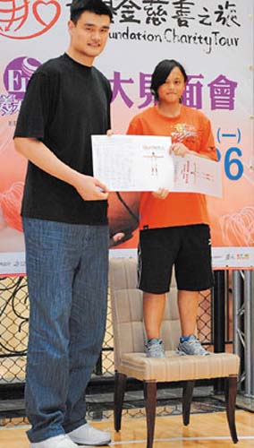 “哇!好高,真的是巨人!”身高只到姚明腰部的桃源中學(xué)一年級女學(xué)生杜儷馨,代表上臺致贈卡片時,特地搬了張椅子墊高,畫面很有趣。