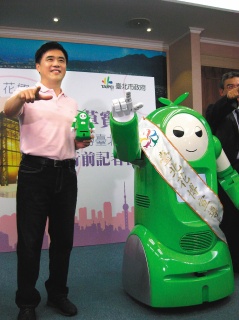 圖為臺北市長郝龍斌日前為臺北花博機器人配戴彩帶,并賦予“香草寶貝”營銷臺北的情形。圖片來源:臺灣《聯合晚報》