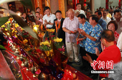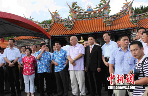 中新網(wǎng)新竹8月18日電(記者 張傳熙)率領(lǐng)廣東省經(jīng)貿(mào)文化交流團(tuán)訪臺(tái)的黃華華省長(zhǎng)今天下午從臺(tái)北抵達(dá)新竹縣展開尋親、訪友的“鄉(xiāng)情之旅”。下午,在新竹縣領(lǐng)導(dǎo)人邱鏡淳及眾多鄉(xiāng)親的陪同下,黃華華到當(dāng)?shù)卮砜图椅幕牧x民廟行禮、祭拜。