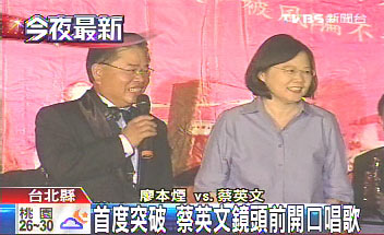 昨晚在永和市樂華夜市,“立委”廖本煙唱“小城故事”,他好幾次想找機會把麥克風往蔡英文面前比,但她像看到火把,馬上靠邊閃。不過電視畫面顯示,蔡英文也還是首度突破自我,開始開口唱歌,看她嘴型,咬字還蠻完整。