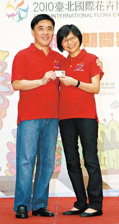 郝龍斌上午并送上一張花博“全期間票”給妻子,作為中秋節和明年的生日禮物,兩人應媒體要求,甜蜜合影,郝龍斌看起來并未受近來“花系列”風暴影響。