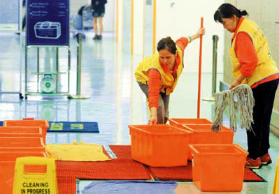 到傍晚八號報到柜臺上方也漏水,由于下面是行李輸送帶,無法放置地毯或毛巾吸水,清潔人員只有把水桶架到報到柜臺上方的框架上接水。另外水滴也滴落報到柜臺通道,除了架設黃色警示板提醒過往旅客注意,航空公司接待人員不時提醒旅客小心行走,避免滑倒受傷。