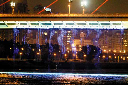 花博夜景25日首度亮相,用40萬(wàn)支塑料瓶磚打造的流行館外墻,4萬(wàn)盞LED燈同時(shí)亮起,還會(huì)變換圖樣,映照一旁橫跨圓山、美術(shù)兩區(qū)的花瓣造型的行人陸橋光雕,行經(jīng)中山北路民眾也不禁停下腳步欣賞。