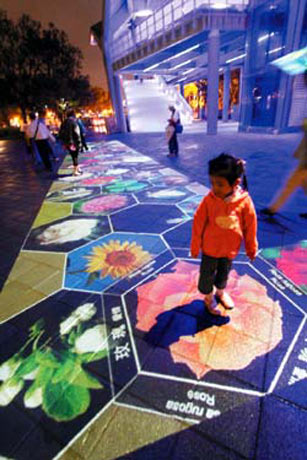 投影光雕有五個互動設計,測試階段只展演“花語寄情”,一踩在投影花苞上,玫瑰、向日葵、茶花、梅花等花卉就會瞬間盛開,還會出現(xiàn)花卉信息,朵朵投影互動花海,恰與一旁地景花海“真花”形成有趣對比。