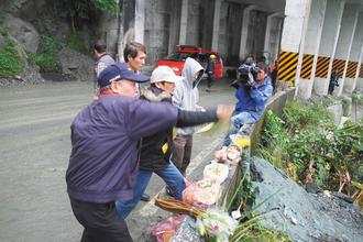 3日是事件發生后的“二七”,創意旅行團司機郭銘麟兒子郭翔、導游曾慶華等家屬帶著鮮花、冥紙,原本要到蘇花公路114.5公里處祭拜,但是搭乘的車輛行駛過112.8公里處,突然有落石掉落,相當危險,決定改在112.8公里祈福,難掩悲傷情緒。