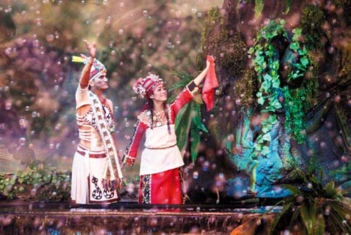 《百合戀》由屏風表演班及少數(shù)民族舞者制作、主演,劇情融合魯凱族親情、愛情,以及人與土地之情,水舞臺有潺潺水瀑,透過9座600公斤油壓臺及像“烤肉架”的鐵網(wǎng)設計,可瞬間切換涌出水來,變成一池寬10米、深9米的湖水,搭配漫天泡沫及魯凱語歌聲回蕩,仿佛置身山谷間。