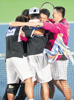 中新網11月15日電 據臺灣《中國時報》報道,中華臺北亞運代表團在廣州亞運會第二天收獲豐碩,上屆在金牌戰失手的軟式網球男子團體賽,昨日借著林鼎鈞與劉家綸在決勝點演出精采逆轉,以二比一后來居上擊敗日本隊,替中華臺北代表團奪得廣州亞運首金。