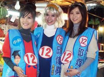 中新網11月25日電 據“中央社”報道,未婚的“政大(臺灣政治大學)4姬”中的三人24日扮孕婦到中和為人助選拜票。三人說,“扮孕婦象征‘好運到’”。