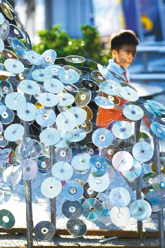 中新網(wǎng)11月8日電 據(jù)臺灣《聯(lián)合報》報道,午后陽光泄照下,臺中市綠園道上,由廢光盤片所組合的裝置藝術,吸引了路人的注目,也讓人感受到廢物利用的美意。