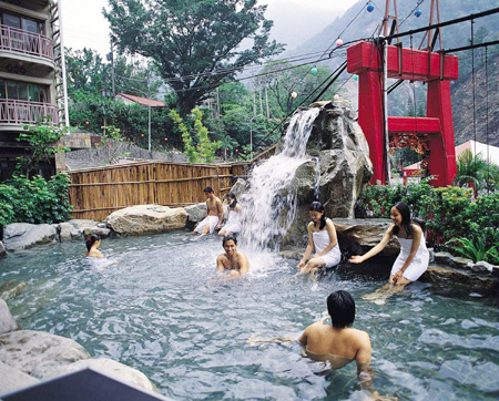 谷關業者為提供民眾更接近大自然的體驗,將以往把溫泉水接到旅館、飯店內的方式改為露天式,同時又在露天溫泉池中設置游樂器材,并強調露天溫泉池是結合溫泉浴、山泉浴及森林浴三浴合一。