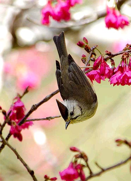 南投掠影:畫眉在櫻花間覓食 好似一幅年畫(圖)