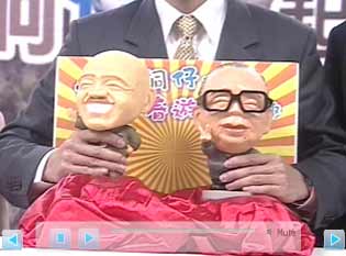 據(jù)臺(tái)灣東森新聞報(bào)道,在主持人的倒數(shù)聲中,慈湖旅游季活動(dòng)正式揭開序幕,桃園縣長朱立倫捧著手中的兩蔣公仔笑開懷,仔細(xì)看,一身招牌軍裝的不正是蔣介石,身旁戴著黑框大眼鏡的是蔣經(jīng)國,兩尊唯妙唯肖的大蔣、小蔣公仔,就是為了慈湖旅游季量身設(shè)計(jì)。