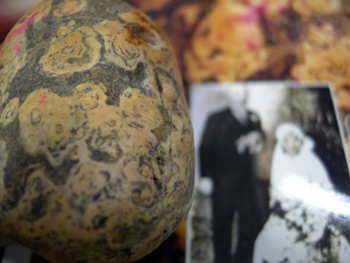 黃清雨12年來撿拾奇石異木為樂,并一一帶回將影像透過計算機放大解析,解讀奇石圖騰,最近他整理奇石計算機檔案圖像,發現其中一顆小石頭,浮現酷似宋美齡婚紗照,渾然天成。