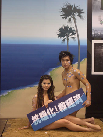 據(jù)“中央社”報(bào)道,記者會(huì)除了展示部分平面海報(bào)外,還請兩名大學(xué)生上演裸體真人海報(bào)秀,以“抗暖化、救經(jīng)濟(jì)”為口號(hào),扮演“海王子”拯救因海水溫度上升面臨生存危機(jī)的“美人魚”。