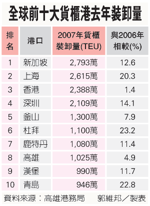 ·據(jù)稱高雄港在全球集裝箱港的排名今年將退到第7