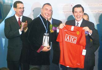 馬英九(右)6日出席臺灣“2008年全球招商大會”,頒發“投資臺灣最佳伙伴獎”給九家在臺投資外商。(圖:臺灣《經濟日報》)
