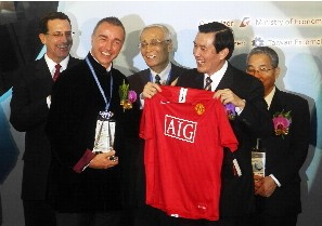馬英九(前右)六日出席“2008年全球招商大會”,同時頒發“投資臺灣最佳伙伴獎”給九家在臺投資外商。