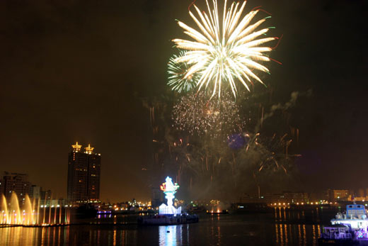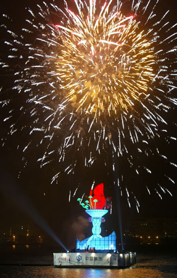 設在高港光榮碼頭海域的主燈,搭配煙花水舞,璀璨繽紛。(圖:臺灣《聯(lián)合報》)