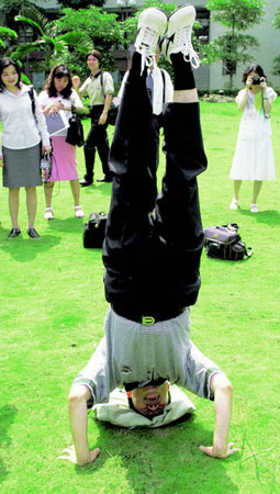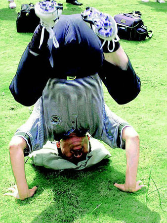 謝長(zhǎng)廷“漏網(wǎng)鏡頭”:臉涂迷彩 大玩倒立(組圖)(2)