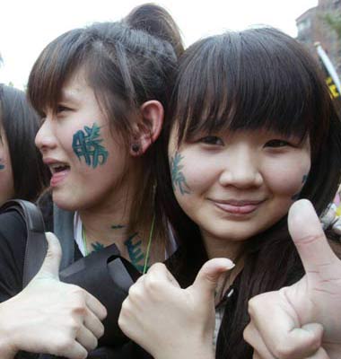 民進黨活動上參加活動年輕人在臉上寫“勝”字挺謝長廷。 聯合報圖