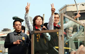 國民黨“副總統”候選人蕭萬長(右一)21日上午回故鄉嘉義市進行車隊掃街拜票,呼吁鄉親要“家己人要挺嘉義人”,讓馬蕭過關。