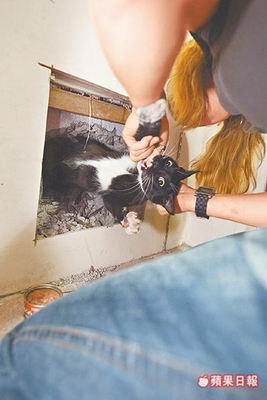 原本協助救援的照顧生命協會與一樓的鞋店商量,企圖敲破墻壁救貓,但店家不愿意,昨因貓咪再度發出求救聲音,店家心軟同意,消防隊員及水電工程人員立刻輪番將水泥墻鉆洞,終于救出受困5天的貓咪。