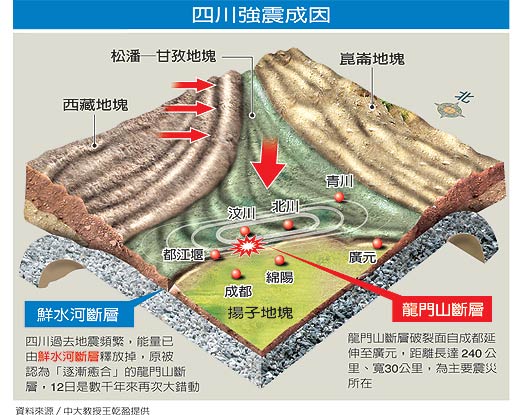 王乾盈說,四川過去百年來發(fā)生的大小地震,只有少數(shù)跟龍門山斷層有關(guān),規(guī)模不大,“以前長時間地震釋放的能量,幾乎都被同在四川的鮮水河斷層消耗掉”,地震專家都以為龍門山斷層的傷口愈合了,不可能再動了。