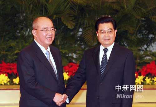 5月28日下午,中共中央總書記胡錦濤在北京人民大會堂會見中國國民黨主席吳伯雄一行。作者:廖文靜