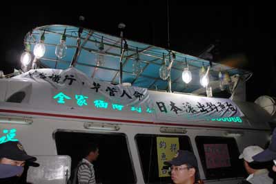 為抗議臺北縣聯(lián)合號海釣船遭日本巡防艦撞沉,保釣人士15日晚間搭乘海釣船出海,船上還掛著“日本滾出釣魚臺”的布條。