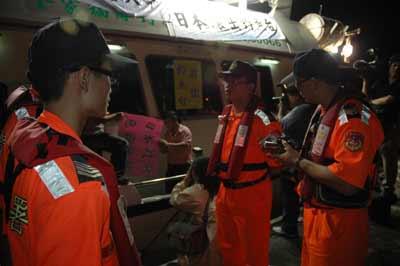 為抗議日本巡邏船在釣魚臺海域撞沉瑞芳籍海釣船聯(lián)合號,保釣行動聯(lián)盟11名保釣人士,15日晚間由臺北縣深澳漁港出海,海巡人員派員隨時戒護。 “中央社”圖