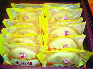 太陽餅是一種源起于臺灣臺中市的點心,又被稱做酥餅,是一種甜餡薄餅,為臺中的名產之一,通常是盒裝作為特產禮物,消費者在知名的店家購買往往須先事先預訂,并在現場大排長龍領取。但除了在這些知名店家購買外,在臺中地區車站的特產店也可以買到太陽餅。