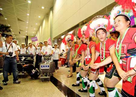 兩岸周末包機啟動,大陸來臺觀光首發(fā)團四日抵達桃園機場后,受到南投縣少數(shù)民族的載歌載舞歡迎,也成為觀光客目光焦點。 “中央社”圖