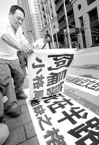 自稱吳淑珍老鄉的施新登(前),在陳水扁家樓下擺放橫幅表示抗議。