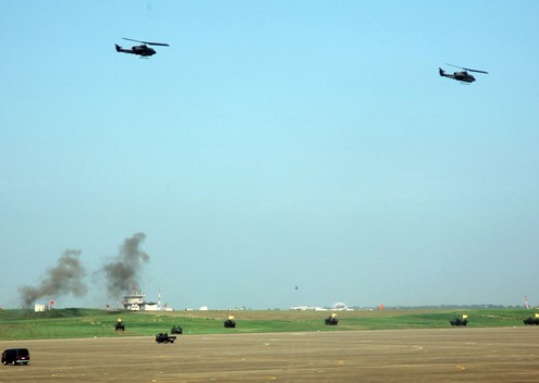 臺軍第五作戰區“漢光24號”演習,23日在臺中清泉崗空軍基地舉行空降暨反空降演練。圖為反空降掃蕩部隊在攻擊直升機火力支持下,防衛軍發起沖鋒攻擊。(“中央社”圖)