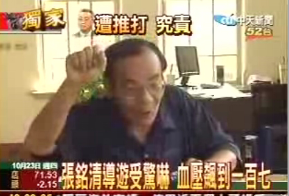 海協會副會長張銘清在臺遭襲事件,不但令國際震驚,就連臺南人自己也被嚇了一大跳。據臺灣中時電子報23日消息稱,當天擔任張銘清在孔廟的導游的江文章,說自己當時被嚇得腦袋一片空白,后來量血壓,竟然發(fā)現血壓飆高到170。